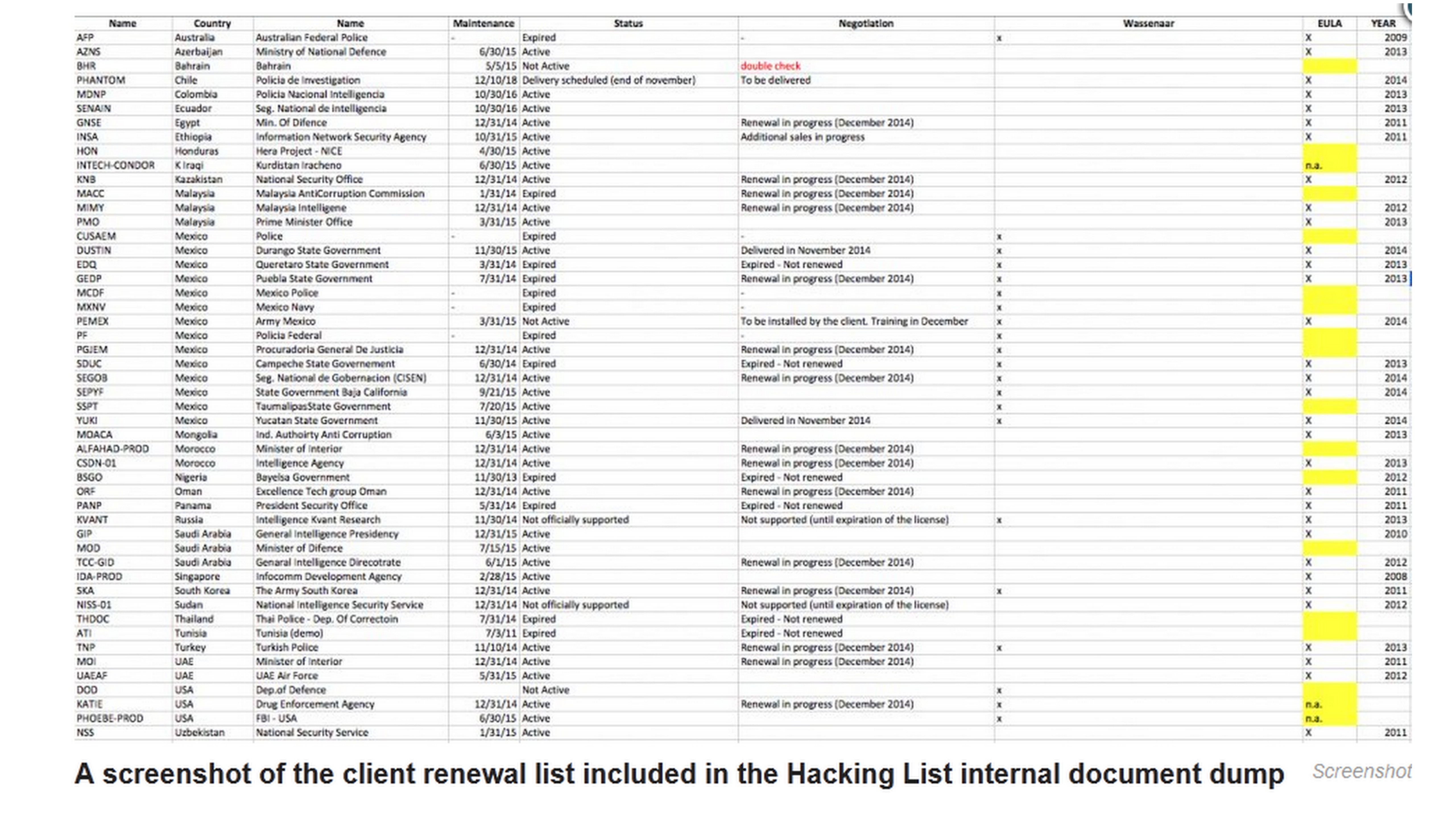 Jeden z ukradnutých dokumentov, je excelovský súbor. V ňom je zoznam krajín a organizácií, ktoré majú s firmou zmluvu. Ide o Maroko, Spojené arabské emiráty, Kazachstan, Azerbajdžan a Sudán sa nachádzajú v tomto zozname. Ostatné dokumenty dokazujú, že firma spolupracuje aj s organizáciami v Egypte.