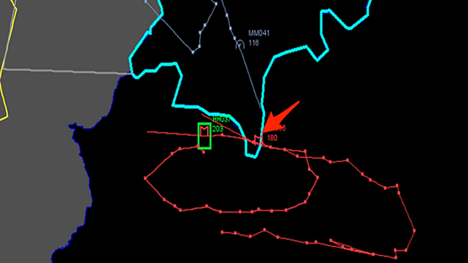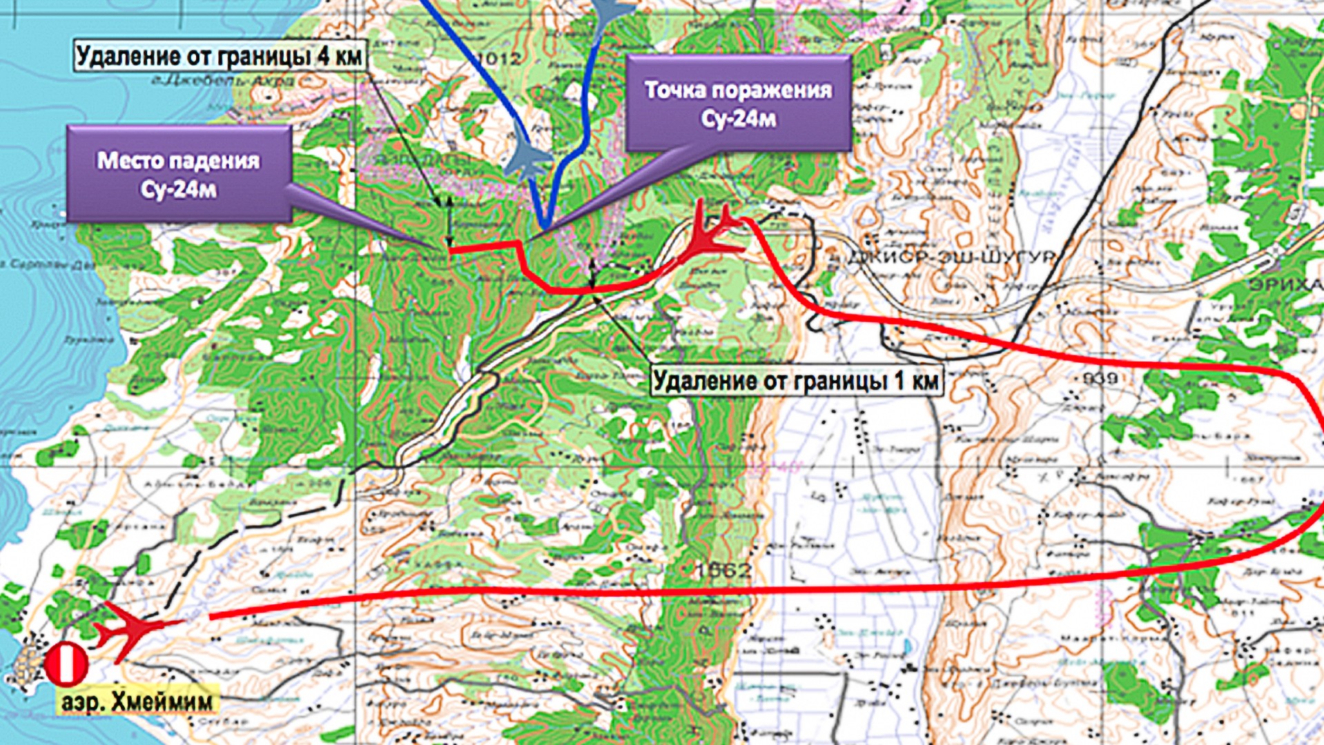 Turecká hranica je fialová, modrá čiara je trasa tureckej stíhačky. Fialový obdĺžnik vpravo označuje miesto zásahu lietadla raketou, ten druhý ukazuje miesto dopadu: