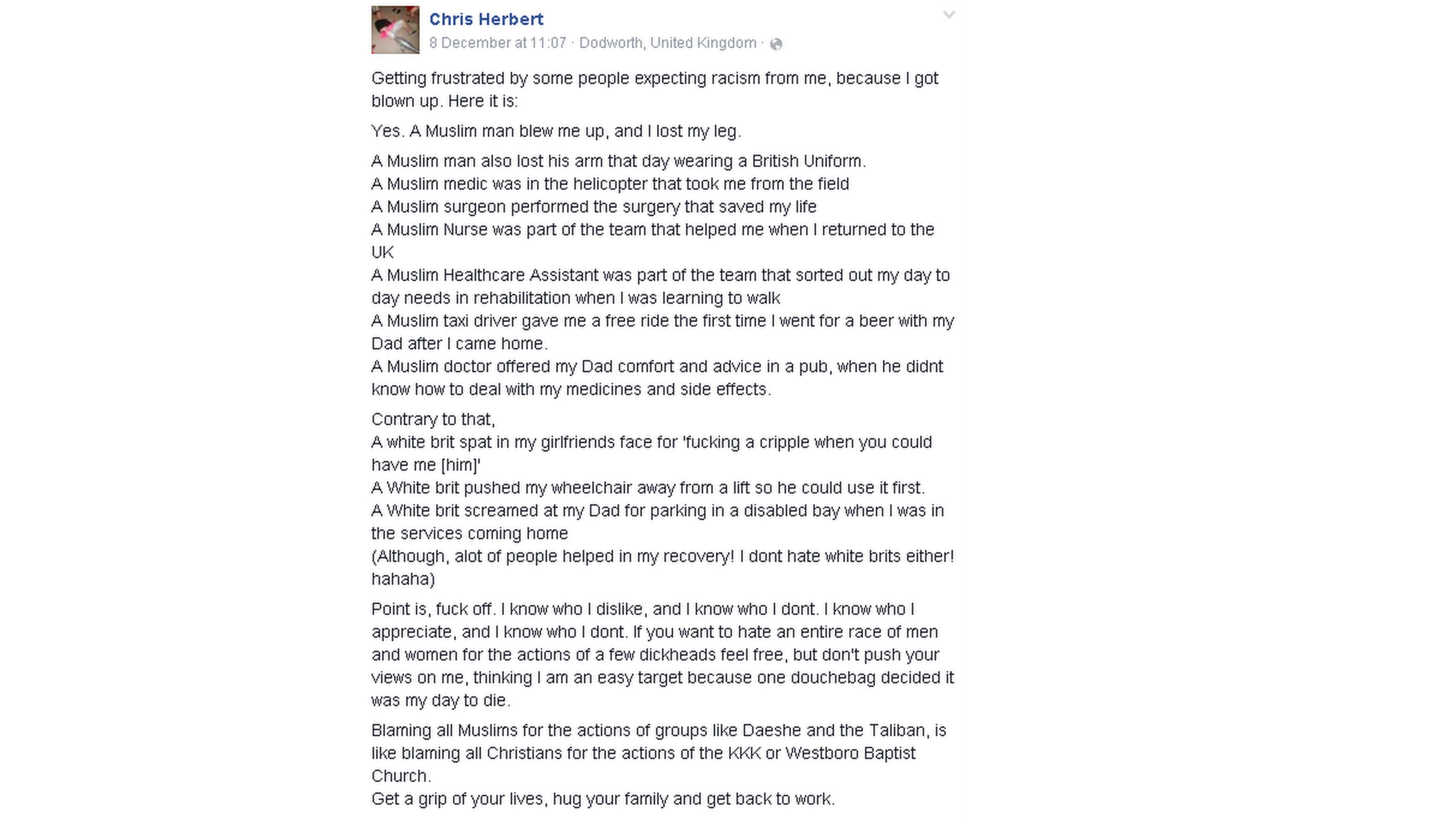 "Áno, moslim ma vyhodil do vzduchu a prišiel som o nohu. Moslim oblečený v britskej uniforme ale prišiel o ruku. Moslimský lekár bol vo vrtuľníku, ktorý ma odtiaľ dostal. Moslimský chirurg ma operoval a zachránil mi život. Moslimská sestra bola v tíme, ktorý mi pomáhal, keď som sa vrátil do Británie," napísal mladý muž na Facebooku.
