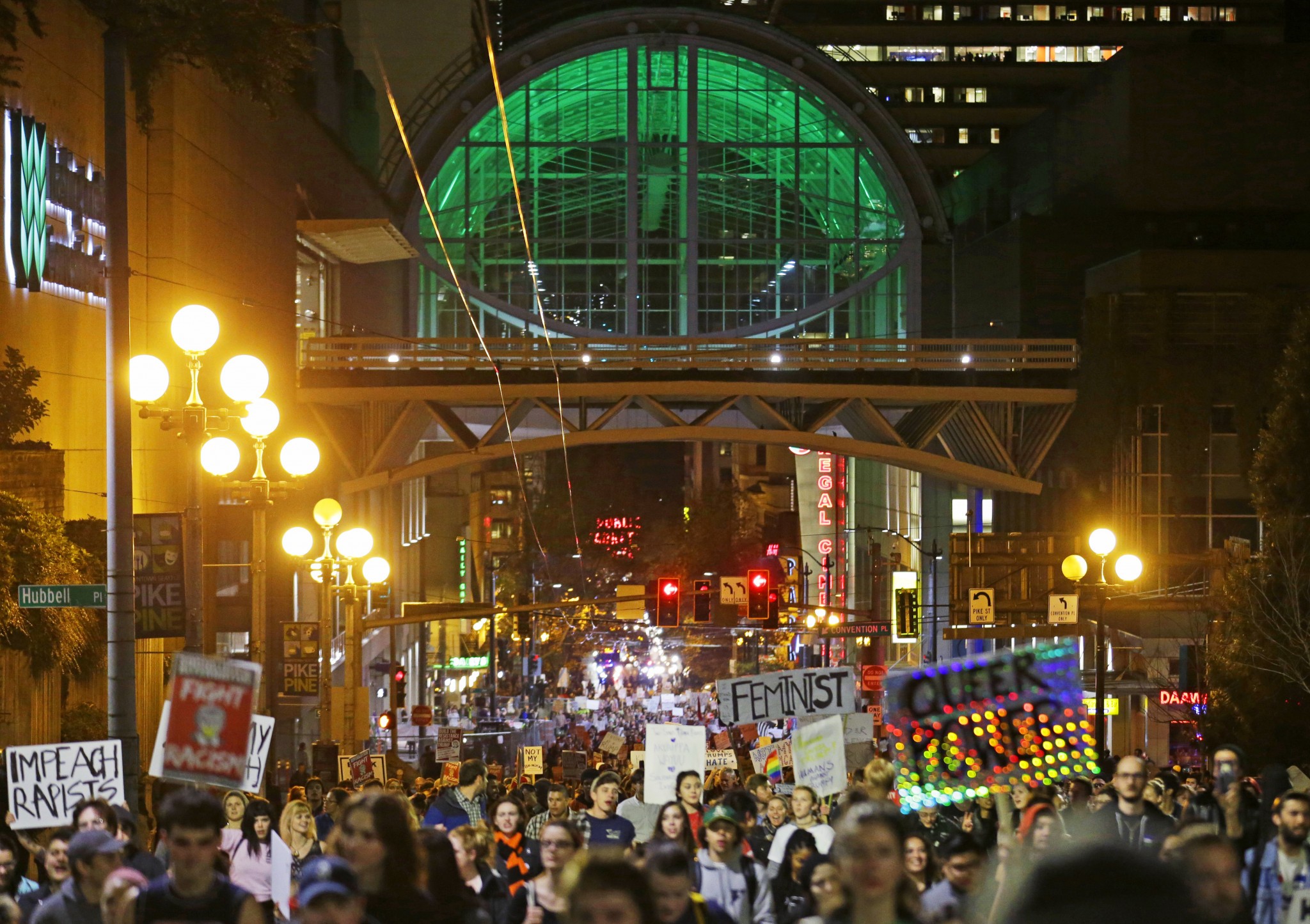 V hlavnom meste Washington sa protestujúci vydali 15. ulicou smerom k Bielemu domu, skandujúc "Láska a nie nenávisť". Na západnom pobreží USA v Seattli vyzývali demonštranti "Povstaňte! Vzdorujte!". Napätá situácia bola aj v Portlande, kde nespokojenci pálili štátnu zástavu, ako aj v Oaklande, kde pochodujúci demonštranti rozbíjali okná, podpaľovali kontajnery a zanechávali na budovách grafity.