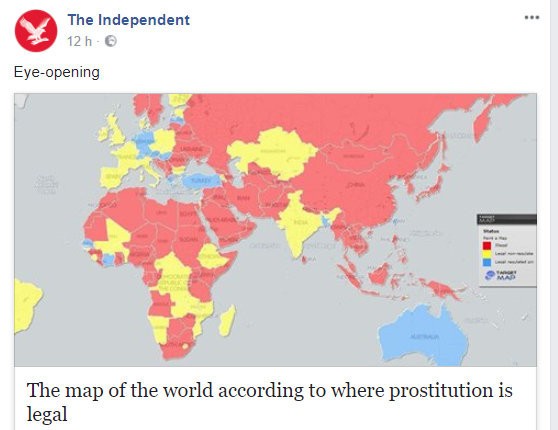 Britský denník the Independent nedávno priniesol na svojich stránkach mapu, ktorá farebne rozlišuje krajiny a postavenie prostitúcie v rámci zákonov. Červená farba označuje krajiny, kde je prostitúcia nelegálna, žltá, kde je legálna, ale neregulovaná a modrá znamená legálnu a regulovanú prostitúciu v krajine.