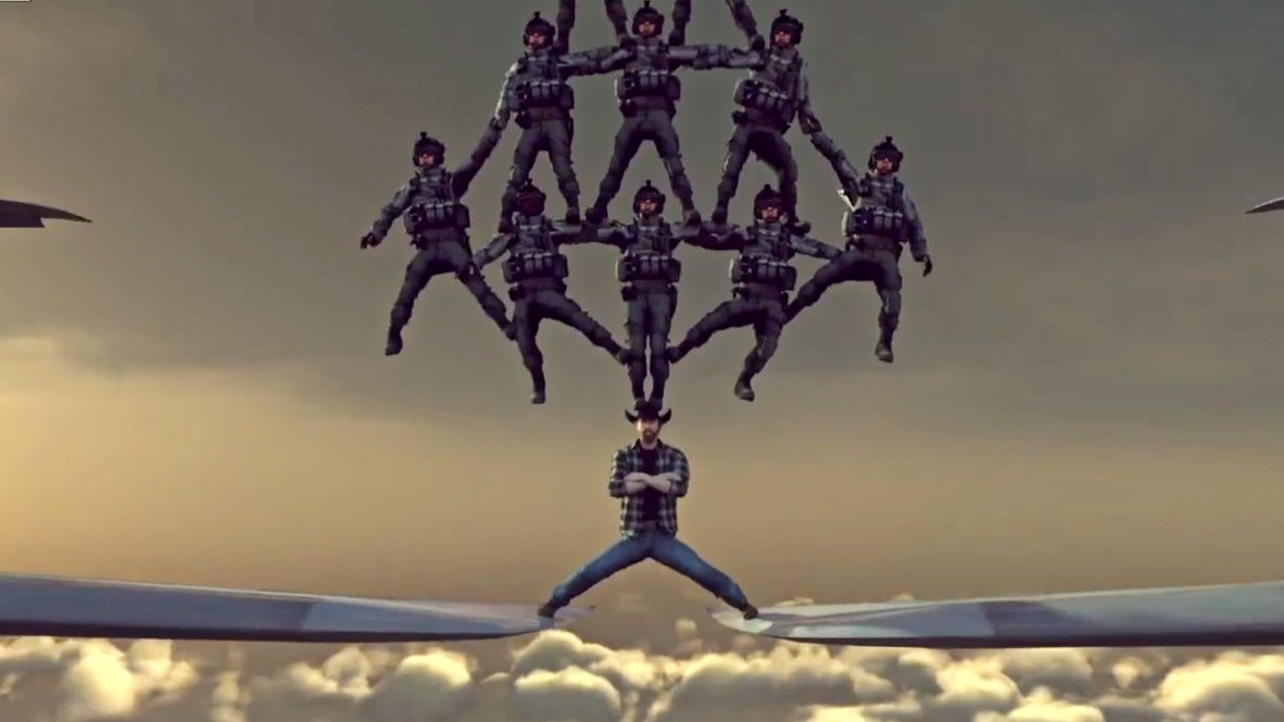 Presne týmito slovami začína záber na obľúbeného akčného hrdinu, ktorý stojí naraz na dvoch letiacich lietadlách. Na Chuckovej hlave stojí pritom ešte 11 pilotov, ktorí znázorňujú vianočný stromček a majú na sebe svetielka. To však nie je všetko!
