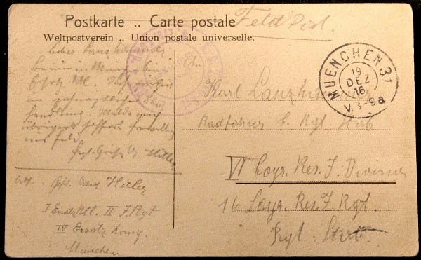 "Rád by som bol opäť s tebou. Bohužiaľ neexistuje žiadna šanca, aby som sa dostal na front, aspoň nie teraz," napísal Hitler Lanzhammerovi. "Nevieš si predstaviť, ako krásne som vyzeral," stojí na pohľadnici.