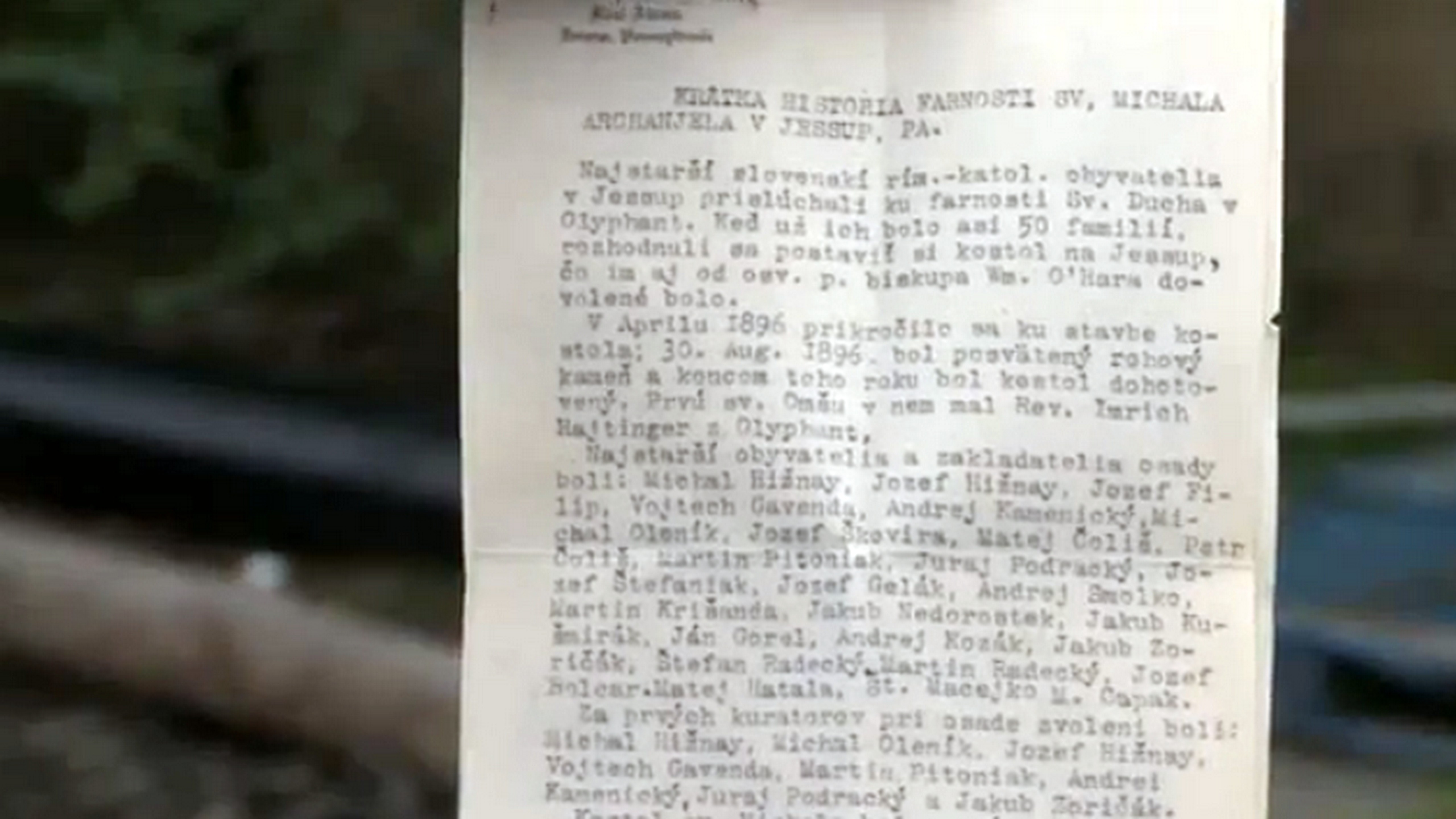 Podľa prekladu je zrejmé, že ide o záznam krátkej histórie farnosti Sv. Michala Archanjela v meste Jessup. Vtedy išlo o osadu a vysťahovalci sa rozhodli postaviť si vlastný kostol. Začali ho stavať v roku 1896, listina obsahuje aj mená zakladateľov osady.