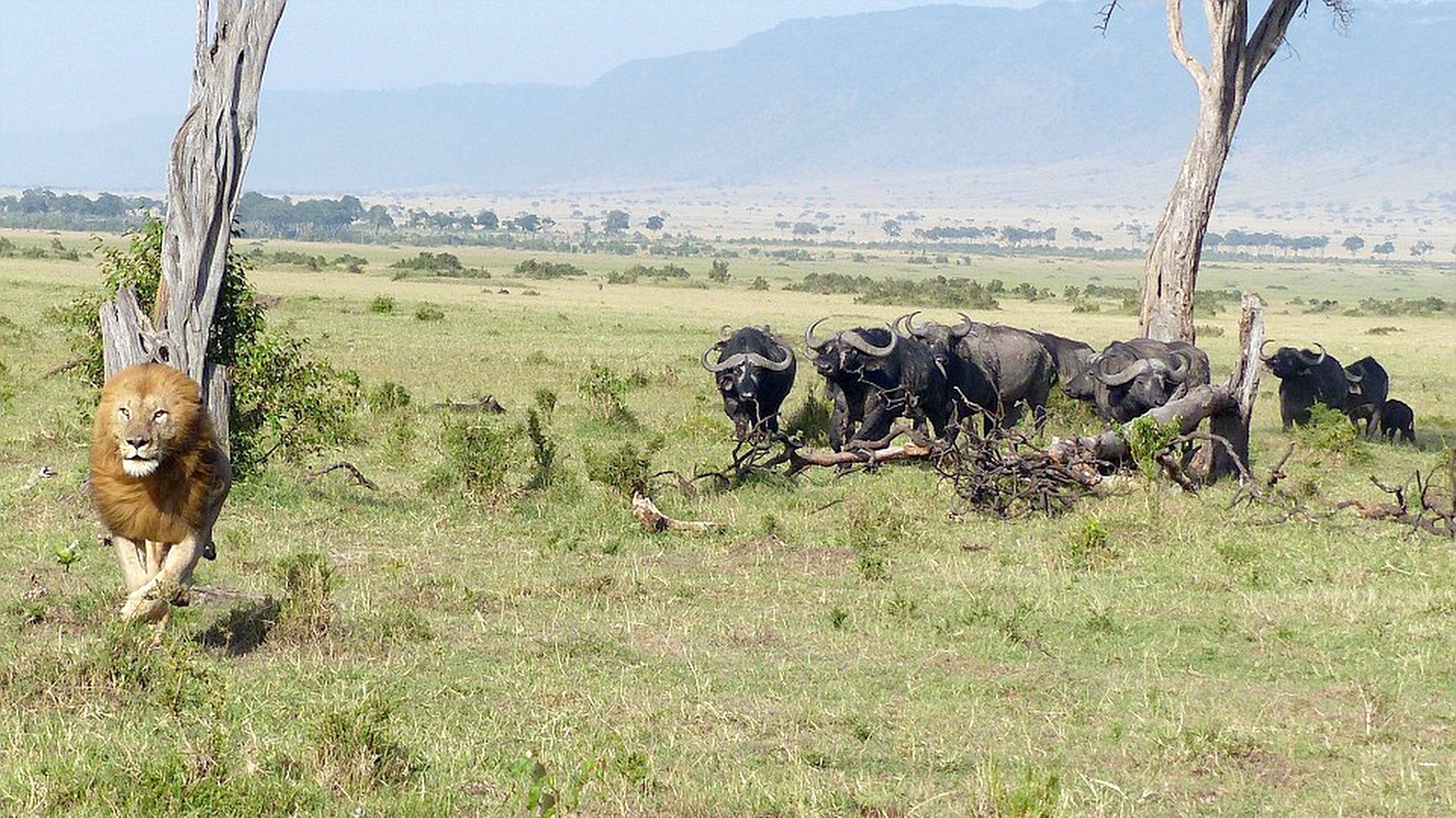 "Zrazu, z ničoho nič, vyskočil zo svojho úkrytu lev a uháňal na blízky strom. Byvoly ho začali prenasledovať," uviedol bývalý vojak.