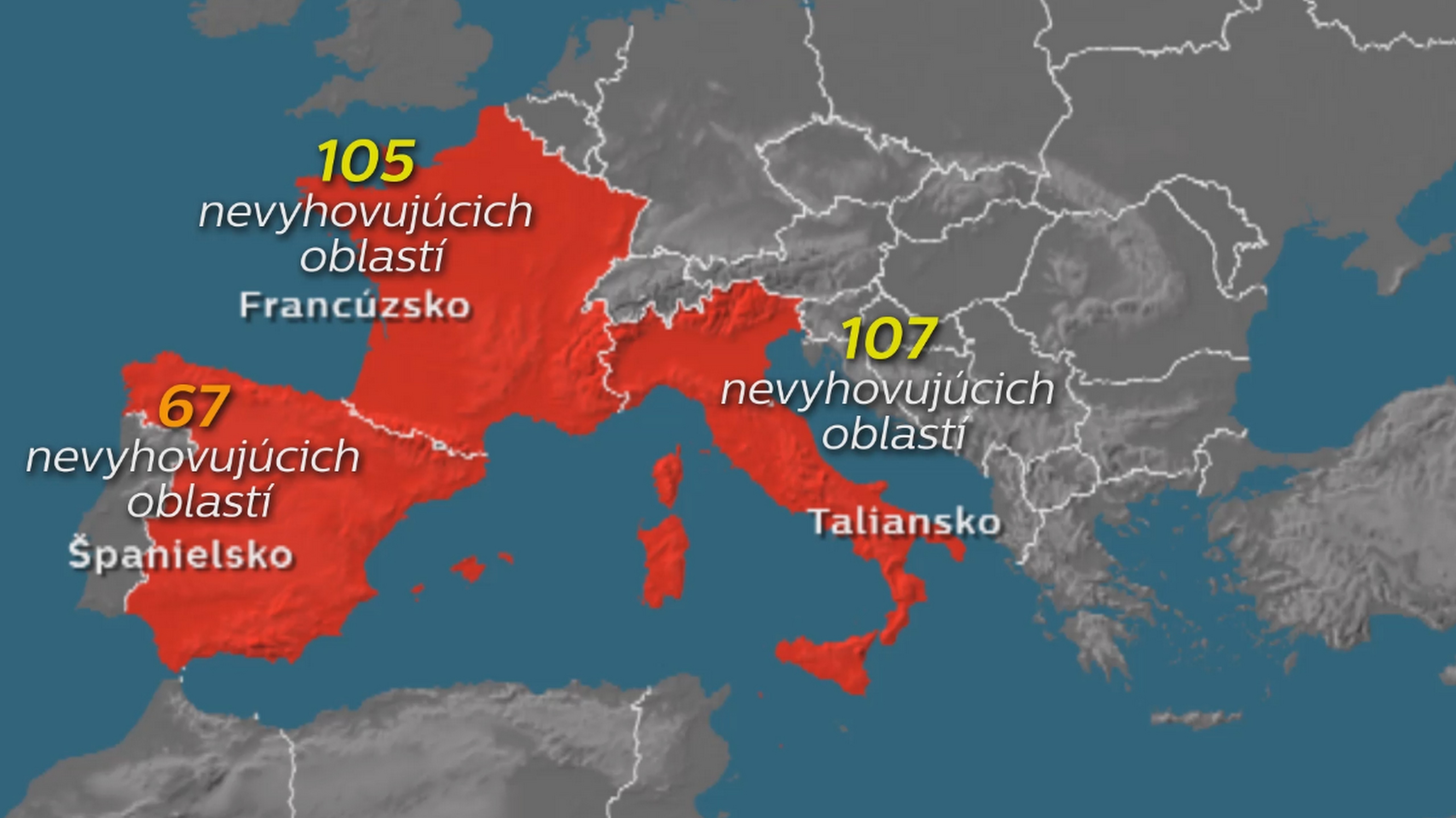 Najviac oblastí s nevyhovujúcou kvalitou vody je podľa analýzy v Taliansku. Tu hygienici neodporúčajú na kúpanie až 107 prímorských oblastí. Nasleduje Francúzsko a Španielsko, kde je ich počet len o niečo nižší.