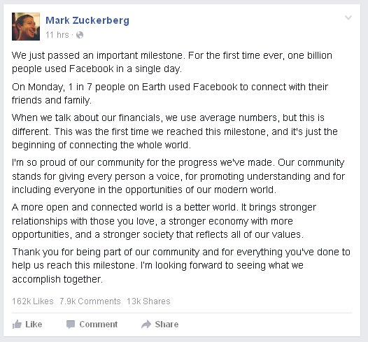 Prezradil, že v pondelok sa na Facebook pripojil každý siedmy obyvateľ planéty, aby nadviazal kontakt so svojimi priateľmi či rodinou. Celkový počet ľudí, ktorí využívajú služby sociálnej siete, presiahol 1,5 miliardy používateľov. Denne sa ich na Facebook pripája "len" 65 percent z nich - asi 968 miliónov.