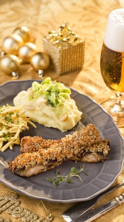 Večer pred prípravou namočíme bôb minimálne na 12 hodín. Ráno uvaríme do mäkka a necháme vo vode, v ktorej sa varil. Majonézu zmiešame s horčicou, citrónovou šťavou, soľou a korením. Zeler očistíme a nastrúhame na hrubom strúhadle. Rovnako nakrájame jablko aj so šupkou. Zamiešame s majonézou a odložíme v chladničke. Zemiaky očistíme, umyjeme, nakrájame a dáme variť v menšom množstve osolenej vody. Pripravíme pyré s maslom a horúcim mliekom. Pór prekrojíme po dĺžke na polovicu, umyjeme a nakrájame na 15 mm kúsky. Opečieme na oleji, pridáme scedený bôb. Primiešame k zemiakom a dochutíme soľou. Rybie filety dve hodiny pred prípravou marinujeme v pive. Potom rozkrájame na 8 kúskov, osolíme a opečieme na oleji, najprv zo strany kože 2 – 4 minúty. V tejto fáze môžeme krátko rybu pritlačiť prstami /alebo vhodným náradím/ k panvici, aby sa koža nekrútila, otočíme a pečieme ešte ďalšiu minútu. Potrieme zmesou mletých lieskovcov, najemno strúhaného syra a masla a zapečieme dozlatista. Podávame na zemiakovom pyré doplnené remuládou.