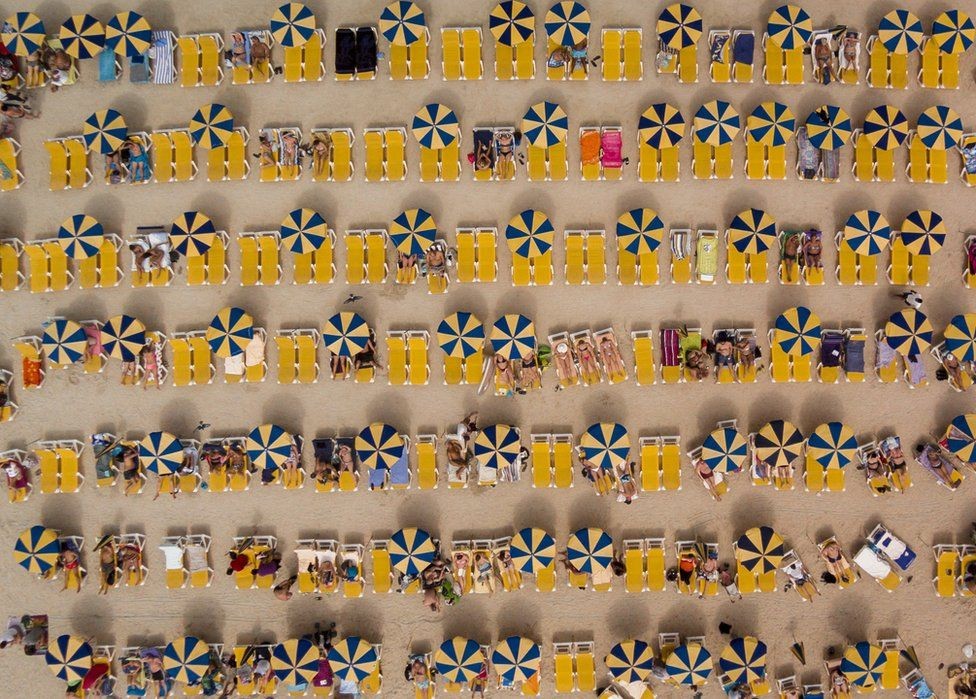 Dokonalá formácia lehátok a slnečníkov na pláži Amadores na ostrove Gran Canaria.